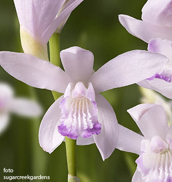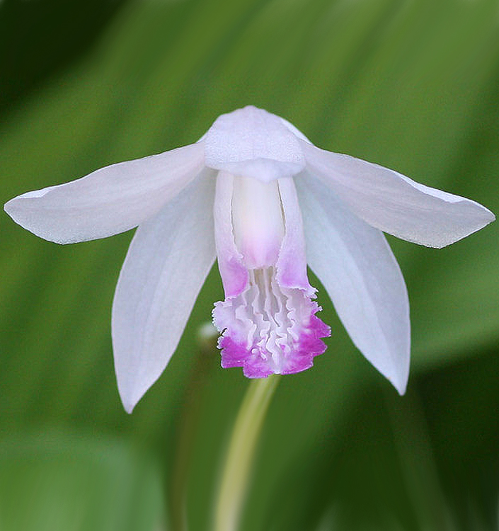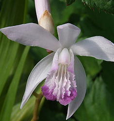 Splendida e rustica selezione dalla specie Bletilla striata 'Alba': fiori bianchi con sfumature rosa-violetto chiaro nel labello.