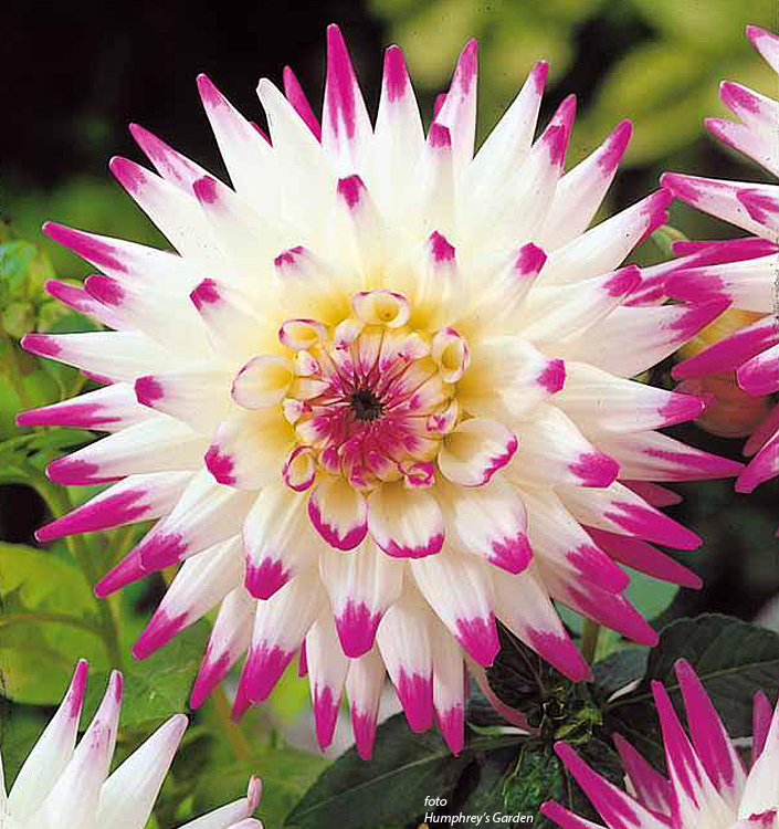 Magnifici fiori con i segmenti appuntiti, di colore bianco crema e le punte lilla-rosso vivace. Ottima forma dei fiori su piante alte e robuste, le quali, soprattutto in autunno, danno enormi soddisfazioni.