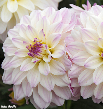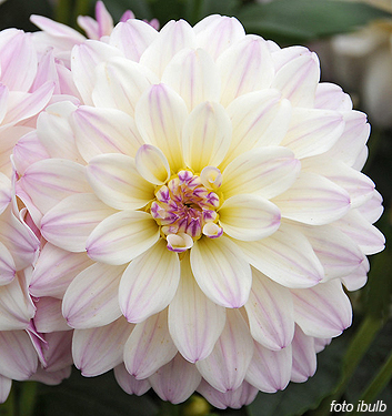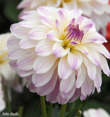 Fiore bianco con riflessi porporino chiaro, centro e punte delle ligule più scuri.