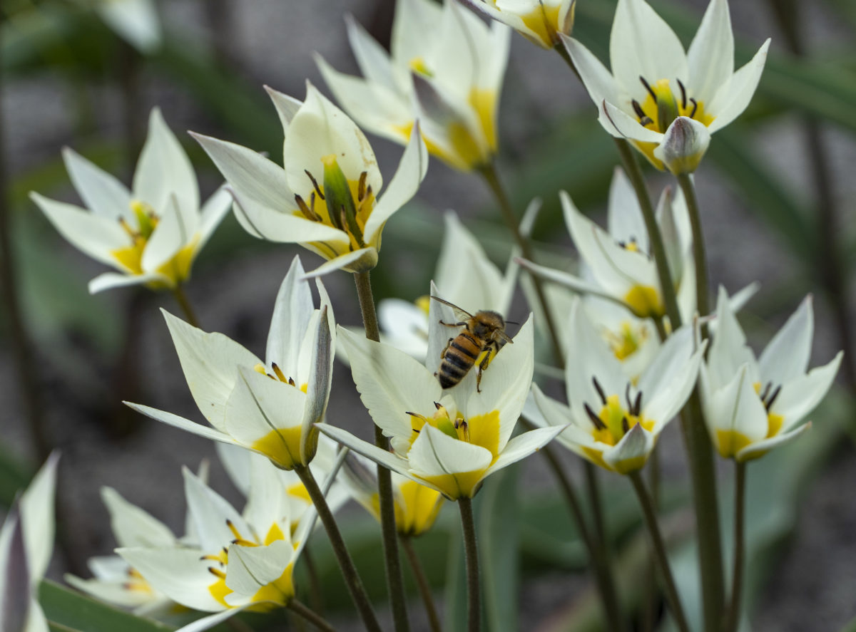 Tulipa turkestanica originaria non solo del Turkestan, ma anche della Cina nordovest, numerosi piccoli fiori (fino 12) per stelo, con odore non piacevole, colore crema con centro arancione, tepali interni notevolmente più larghi di quelli esterni, fiori frequentemente leggermente penduli, dando un effetto elegantissimo alla pianta. Foglie verdi o glauche
