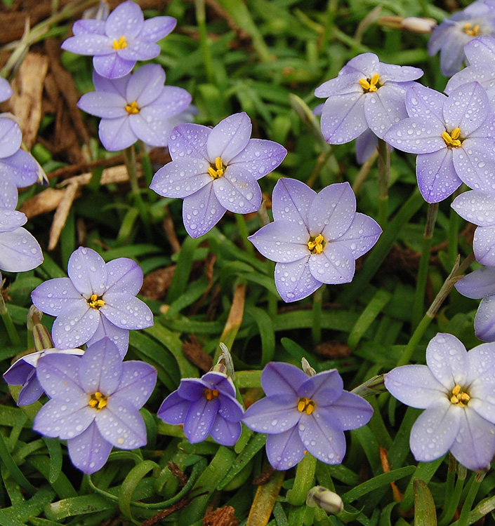 Non esiste ancora un nome comune italiano per gli Ipheion. In inglese si sta diffondendo il nome “Spring Starflower”, il quale descrive bene la caratteristica principale dei fiori di Ipheion uniflorum : la fioritura primaverile e la forma a stella dei tepali disposti orizzontalmente sopra una breve sezione ad imbuto, in cui si trovano gli stami. I fiori profumati sono generalmente solitari e sono portati su steli della lunghezza fino a 15 cm. In funzione della dimensione del bulbo, di colore bianco, possono essere presenti uno o più steli fiorali. I bulbi danno vita a numerosi bulbilli laterali. Questa cultivar è particolarmente apprezzata per i suoi fiori di colore blu-viola. Nelle condizioni ambientali favorevoli la pianta può diventare un bellissimo elemento invasivo, da sfruttare soprattutto sotto cespugli ed arbusti a foglia scura. Le foglie dell’Ipheion uniflorum sono lineari, piatte e verde chiaro, disposte in maniera che gli steli fiorali siano ben visibili.