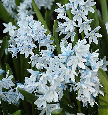 Fiori di colore blu chiaro-celeste e bianco in dense infiorescenze.